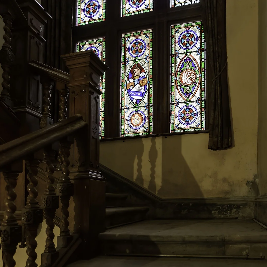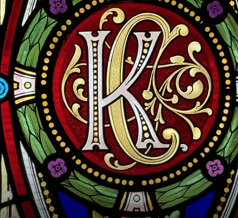 ◂ Katherine Carleton’s initials commemorate her tenure in the main staircase’s leadlight window.