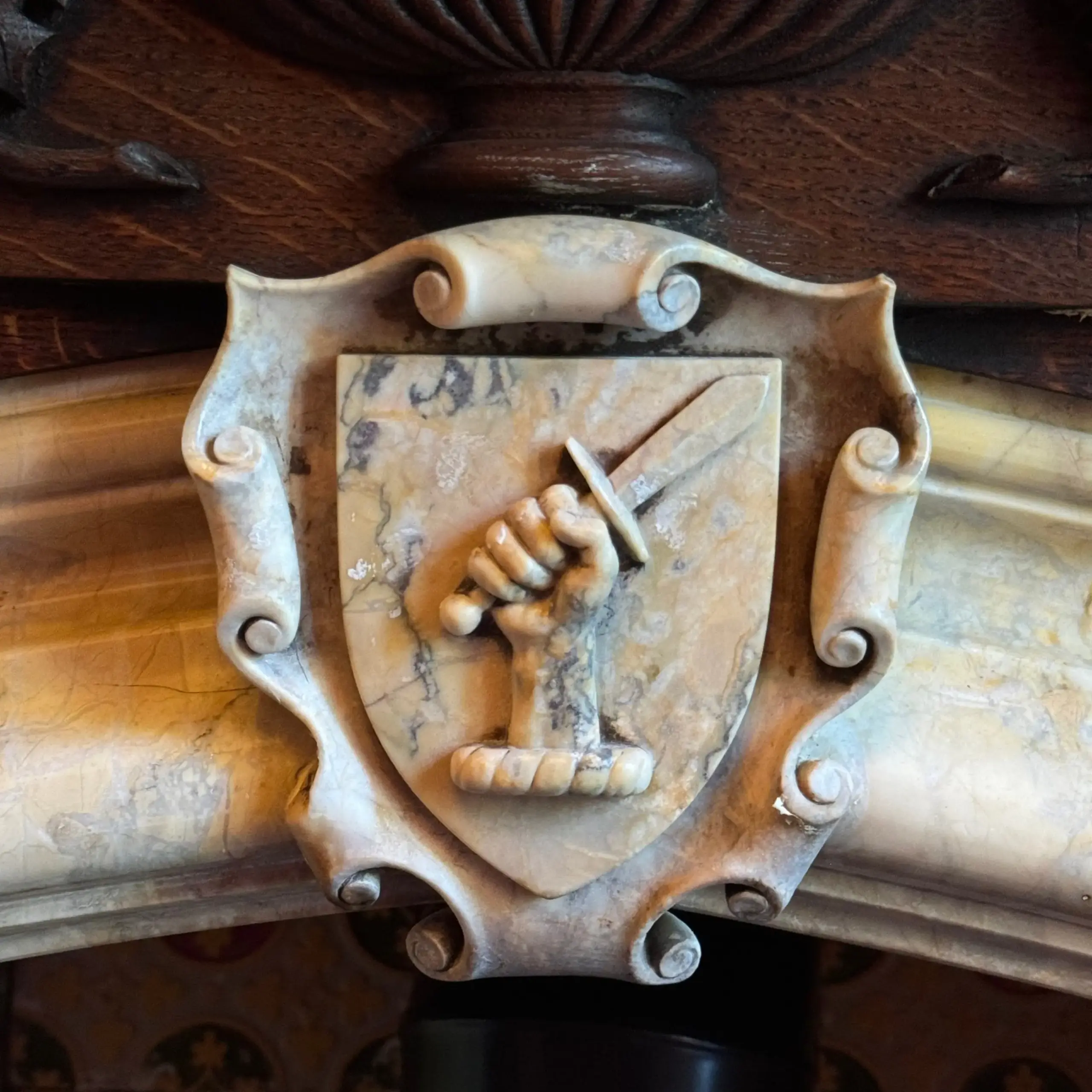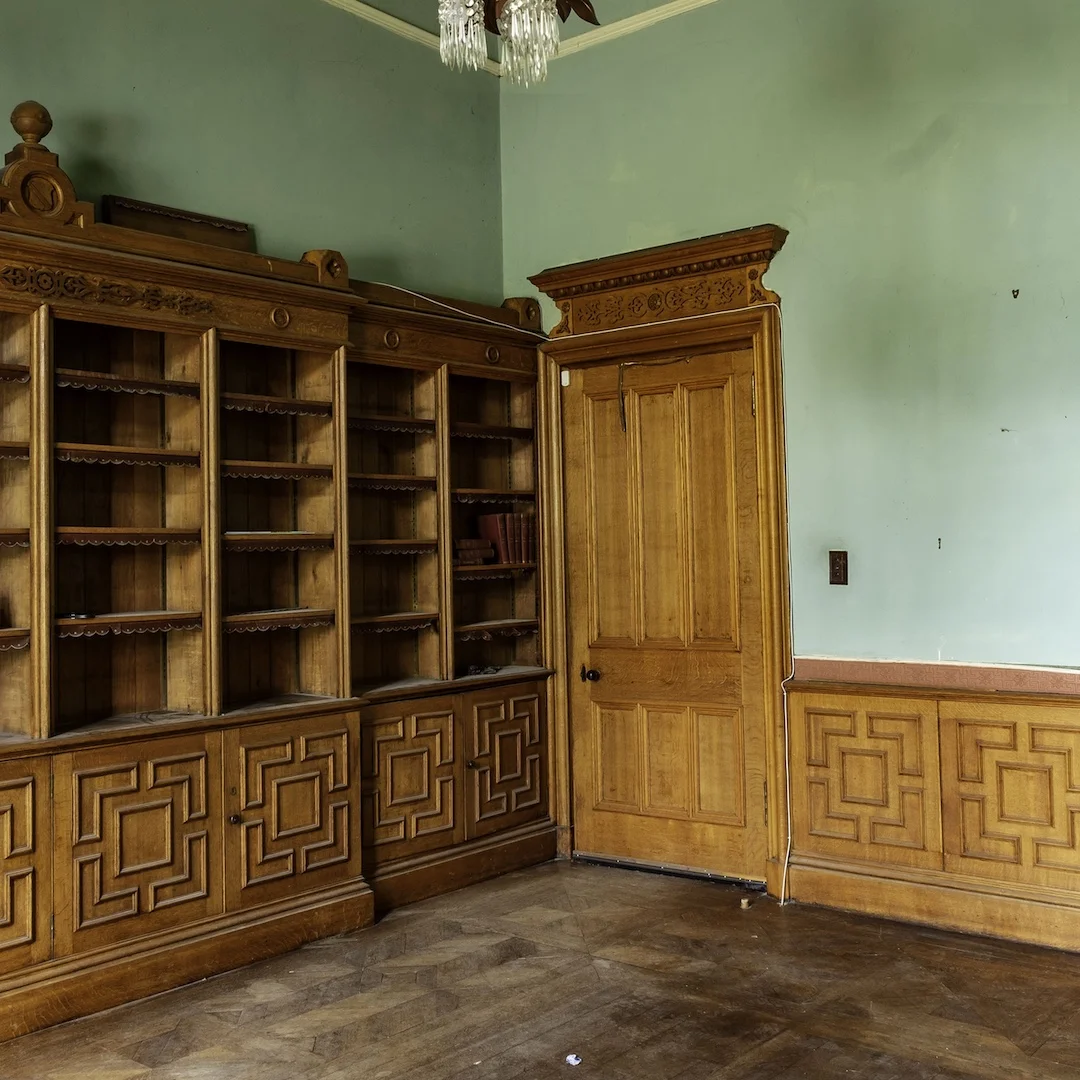 ◂ The Johnston coat of arms still graces the heraldic cartouche on the fireplace in Gilford Castle’s library.