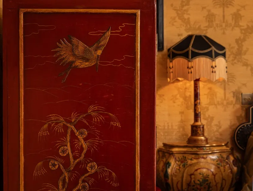 ◂ Selected pieces throughout the castle recall the Wright family’s connections to the Far East.
