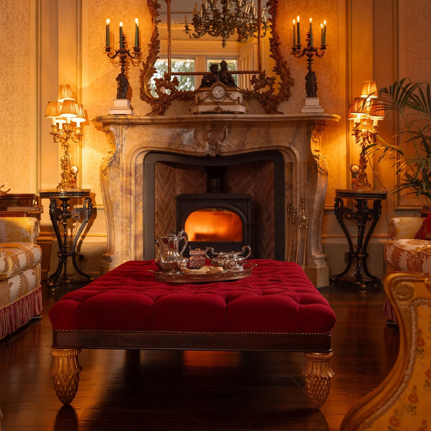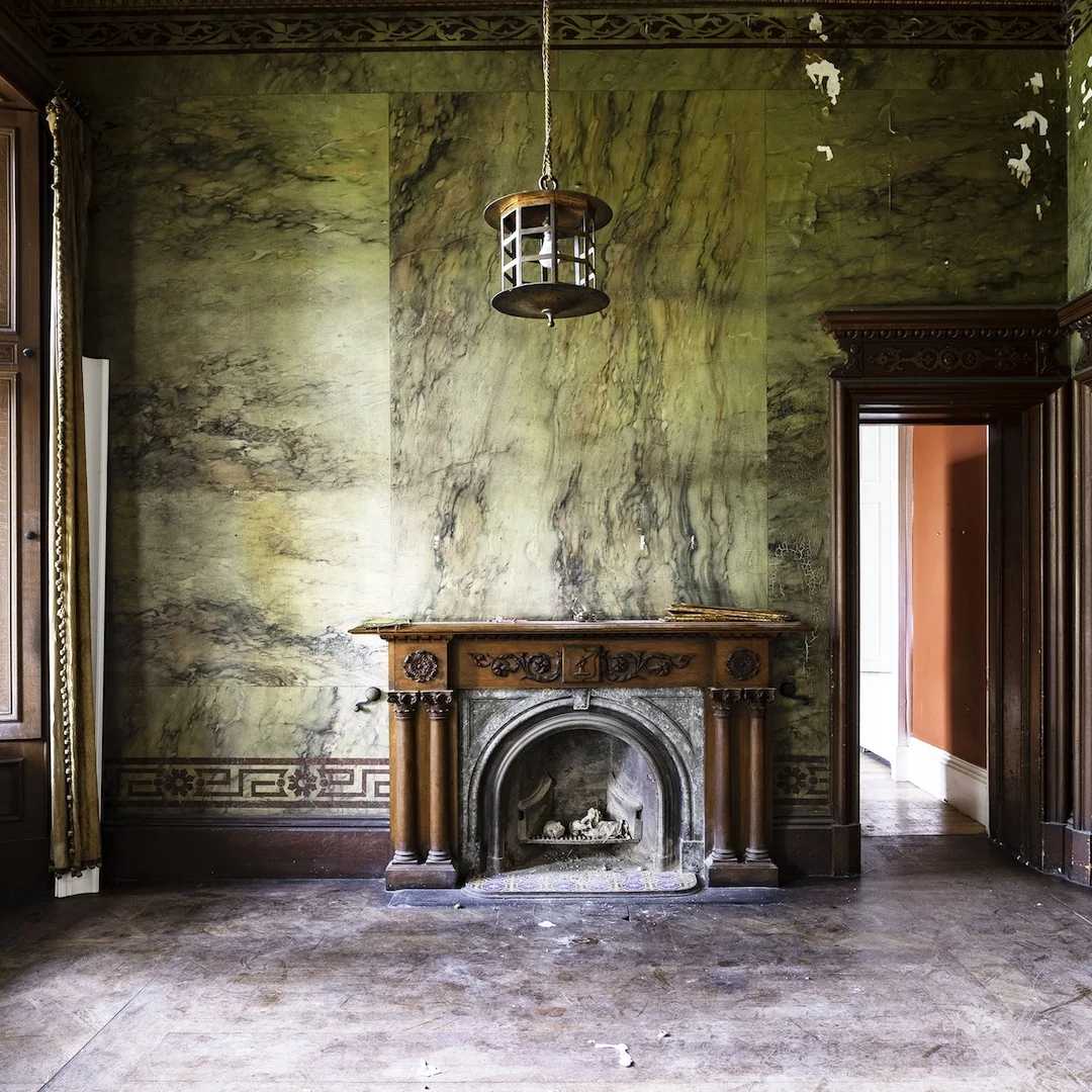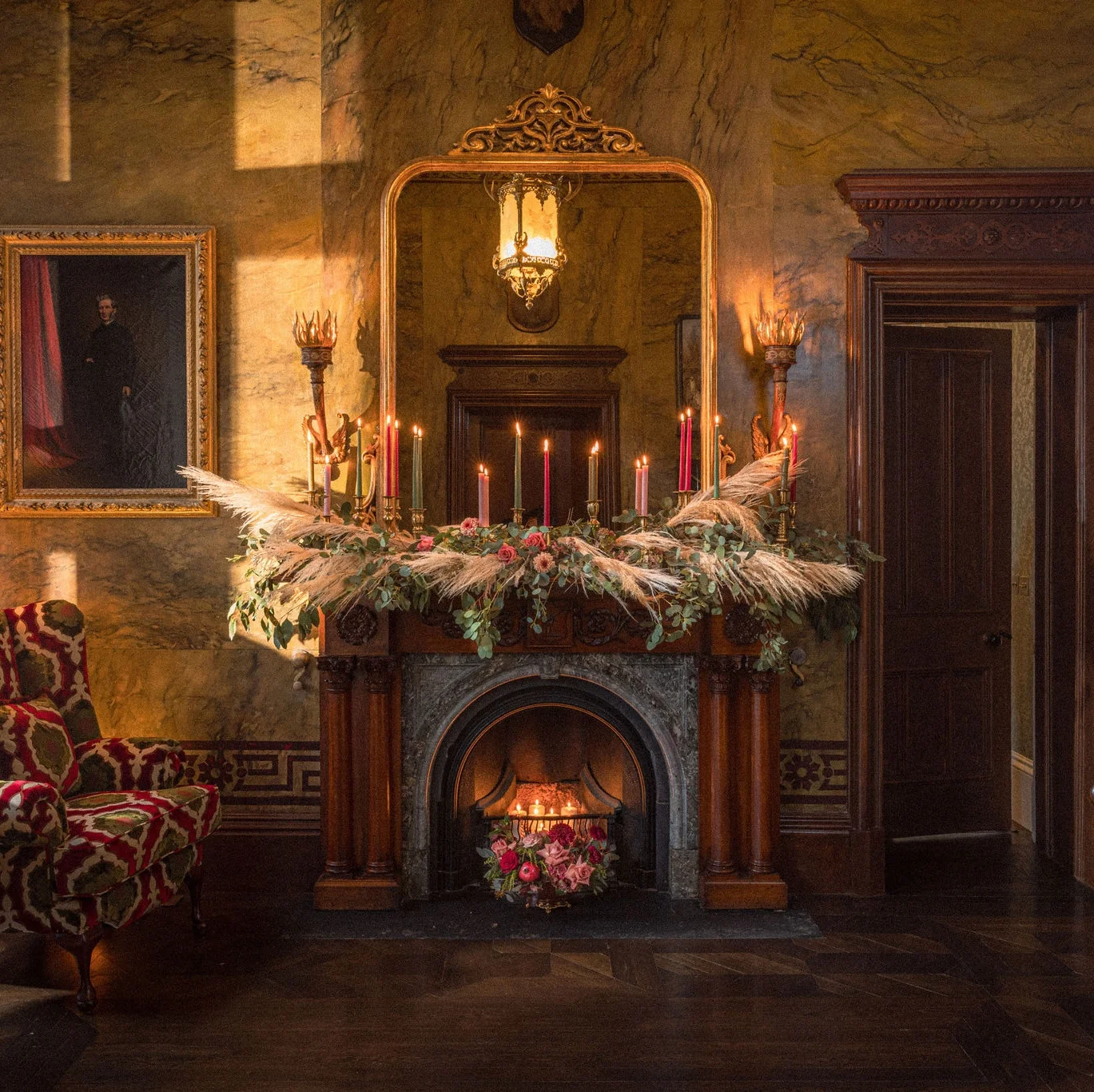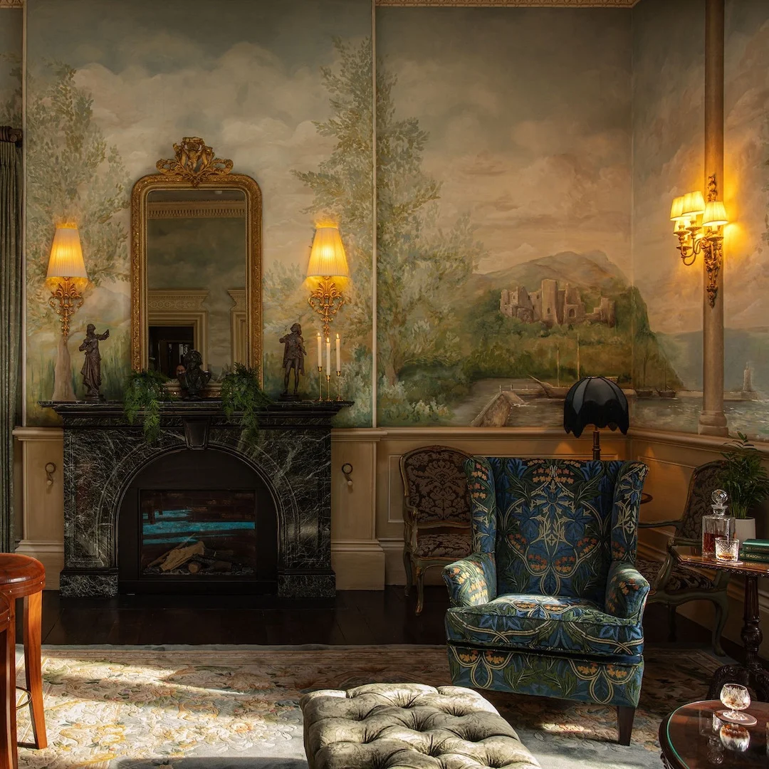 The Moffetts found Gilford Castle’s entrance hallway faded and timeworn, but brought restored it with the same attention to detail that characterised its original craftsmanship. They conserved the decorative plaster and oak detailing, revived the faux marble walls’ original tone, and reintroduced warmth through carefully chosen furnishings and lighting. Today, the space greets guests with the same rich welcome it afforded visitors more than a century ago.