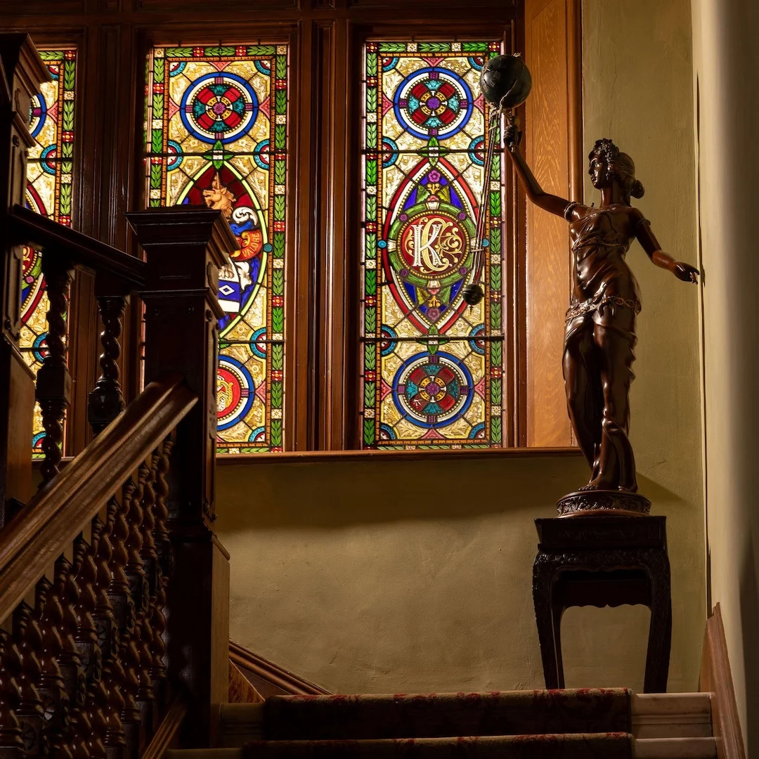 The Moffetts have sensitively restored the main stairwell, conserving its original oak balustrade and stained glass while renewing the plasterwork and joinery with care. The space now glows with daylight filtering through the great windows, the warm light of the chandelier above, and the soft illumination of wall sconces on either side.